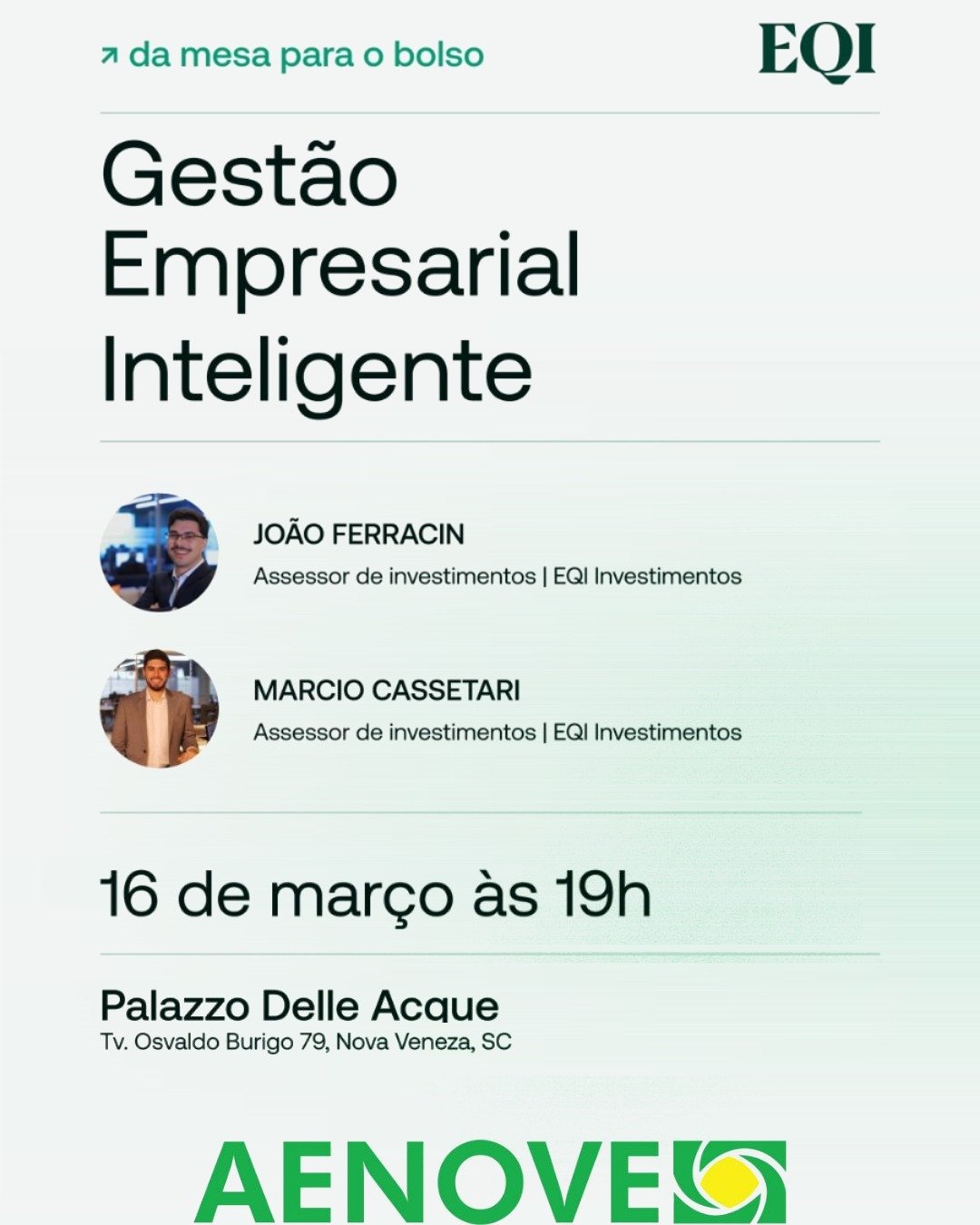 A AENOVE, em parceria com a EQI Investimentos, promove um encontro exclusivo voltado a empresários que buscam aprimorar sua forma de gerir, investir e tomar decisões estratégicas em seus negócios.